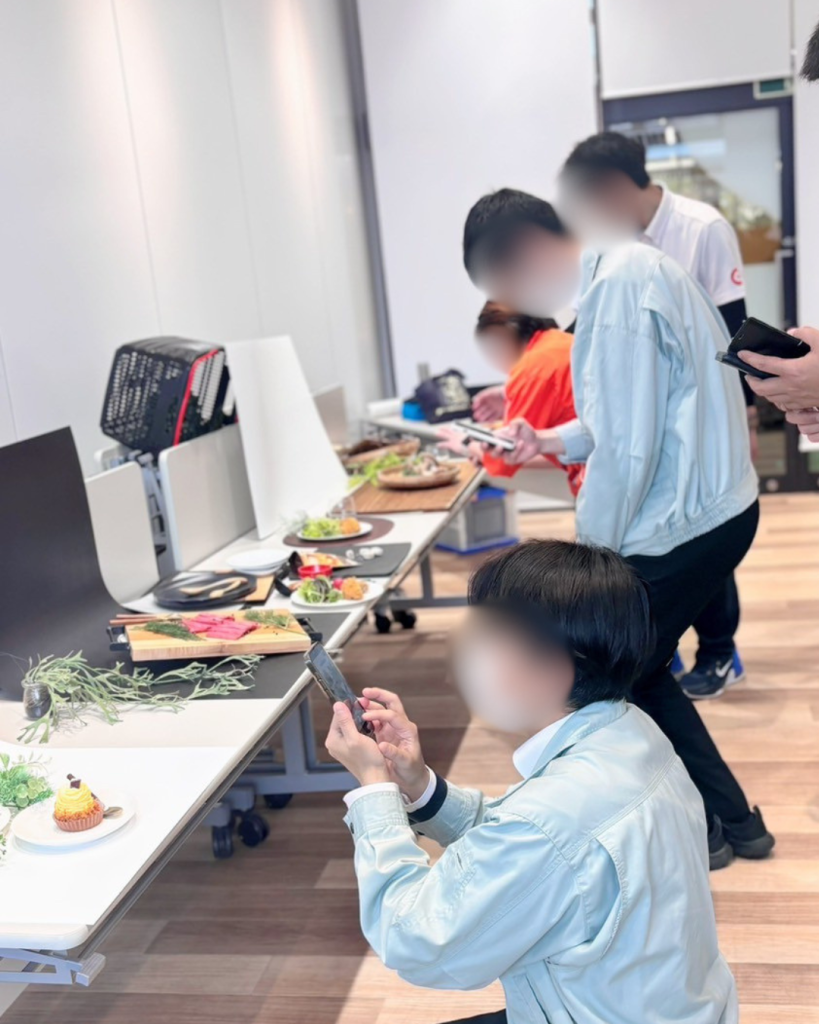 お肉や、ケーキ、メンチカツなど、実際の商品と小道具を使って魅せる方法に、みなさん興味津々です。